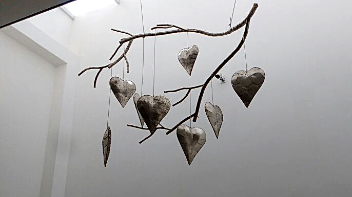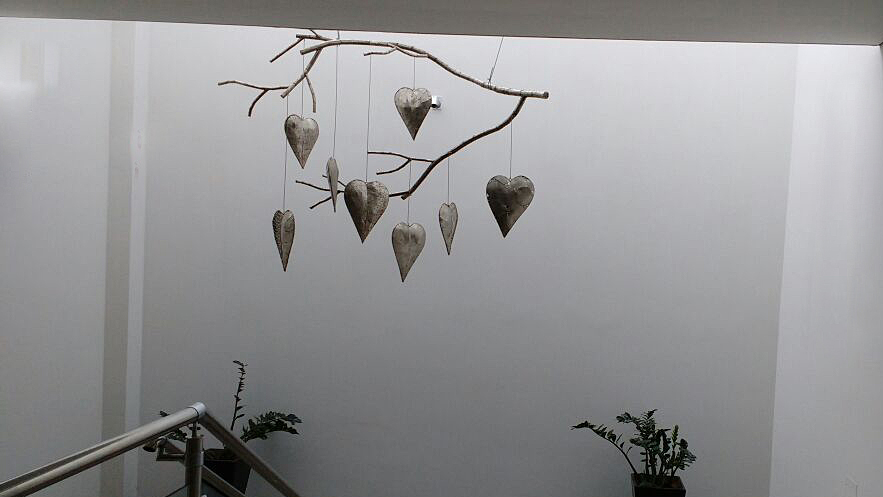 Descrição - Projeto executado pelo escultor Ze Vasconcellos de corações pendurado por fios presos a um galho seco de árvore, representando a fragilidade do sentimento humano.