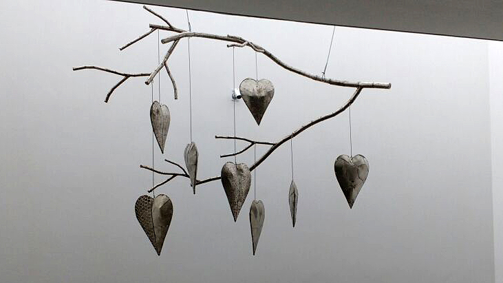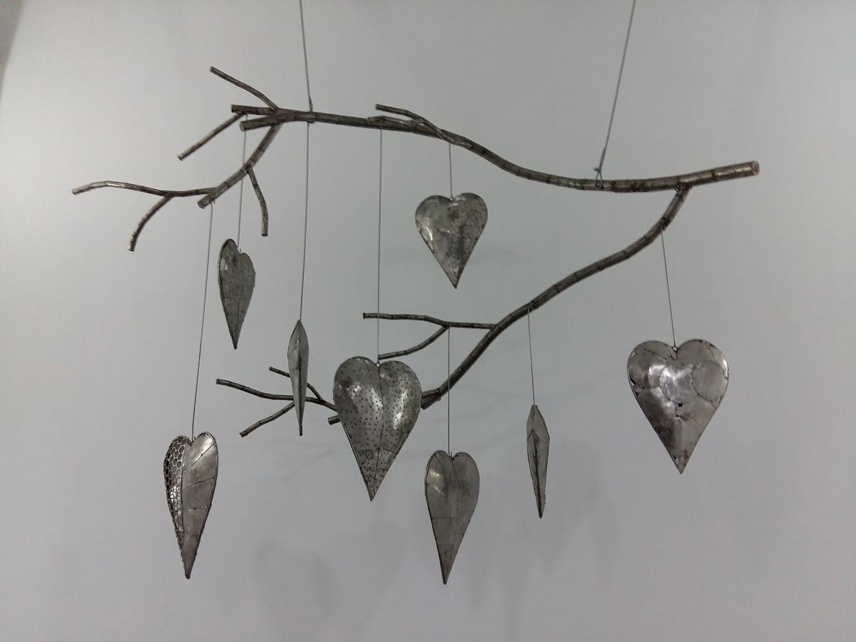Description - Design executed by the sculptor Ze Vasconcellos of hearts hanging by strings attached to a dry branch of tree, representing the fragility of human feeling.
