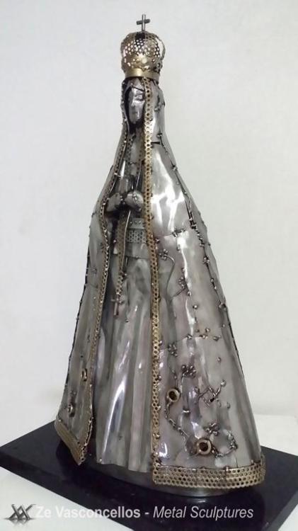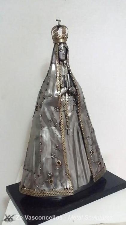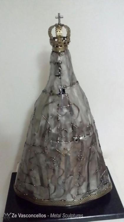 Descrição – Mini escultura em aço inox reciclado de uma Nossa Senhora da Aparecida, santa padroeira do Brasil.