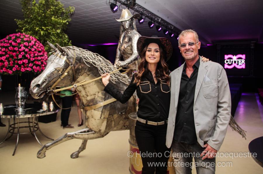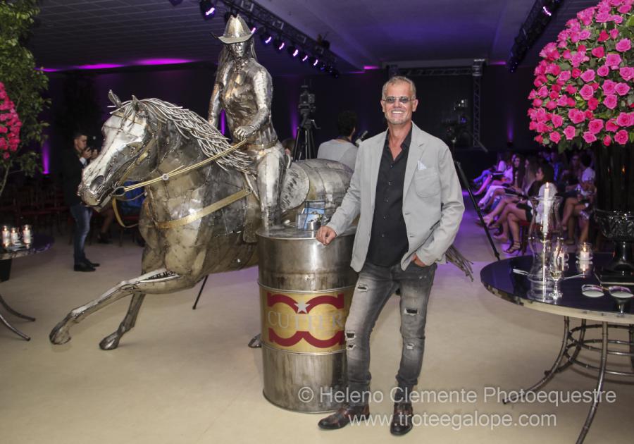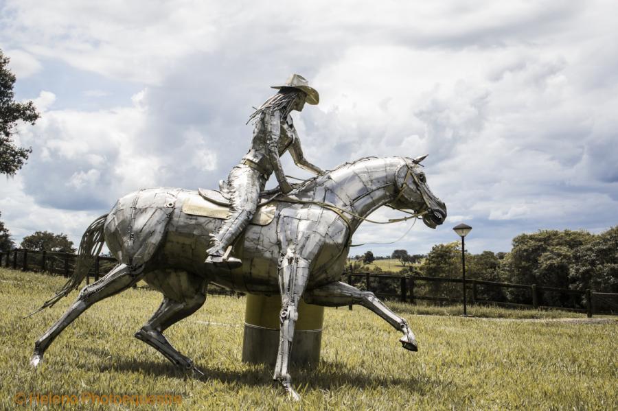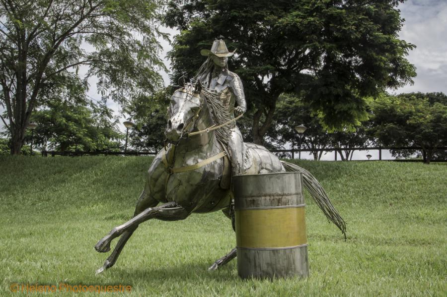 Descrição – Escultura em aço inox com grande movimento, onde o cavalo tem um grau de inclinação de 40º do solo. A obra representa o esporte com uma amazona vestida com roupas estilo norte americano e chapéu. A escultura se apoia no tambor.