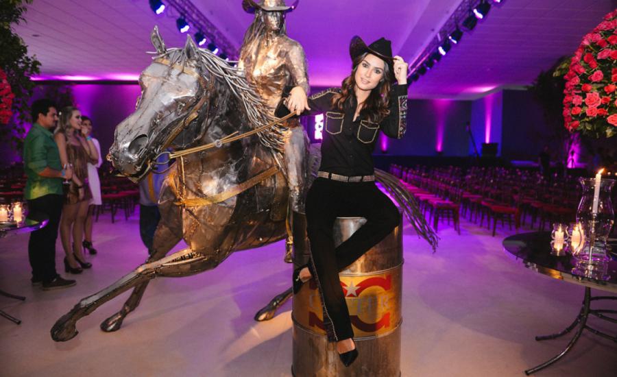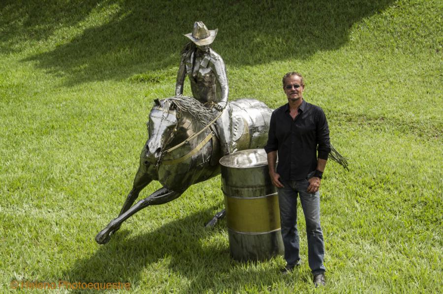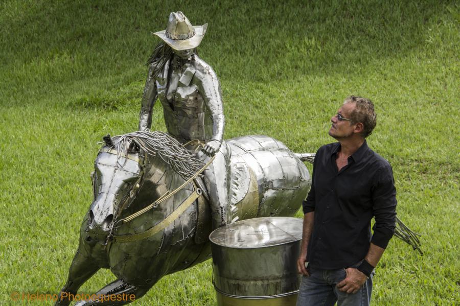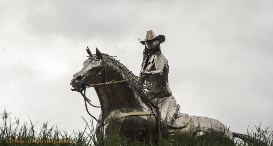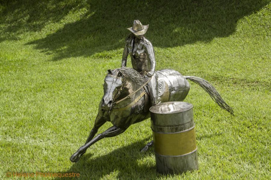 Description - Sculpture in stainless steel with great movement, where the horse has a degree of inclination of 40º of the ground. The work represents the sport with an amazon dressed in North American style clothes and hat. The sculpture rests on the drum.