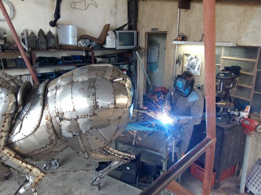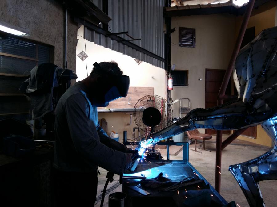 Material – Aço inox reciclado, retalhos de chapas, parafusos, molas, ferradura, etc.